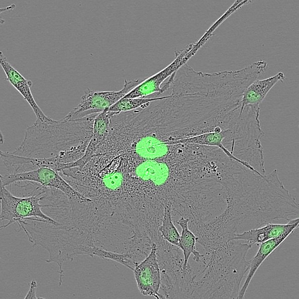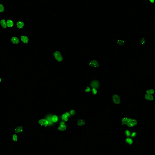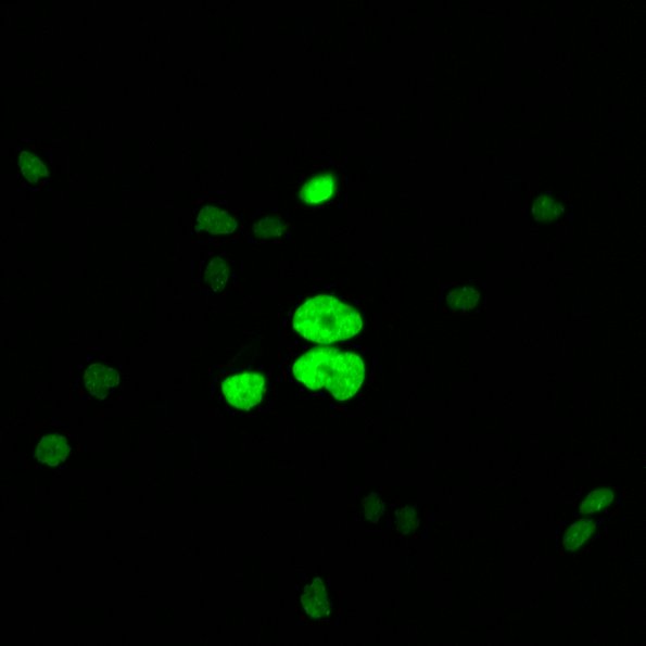 To measure DNA damage we use the 53BP1 protein, which acts on cell cycle checkpoint signaling and on DNA repair through non-homologous end joining recombination. When a double-strand break (DSB) occurs, 53BP1 is recruited and accumulates, forming foci on the damage sites. Each nuclear focus indicates a site of DSB, and the total count indicates the degree of cell damage.