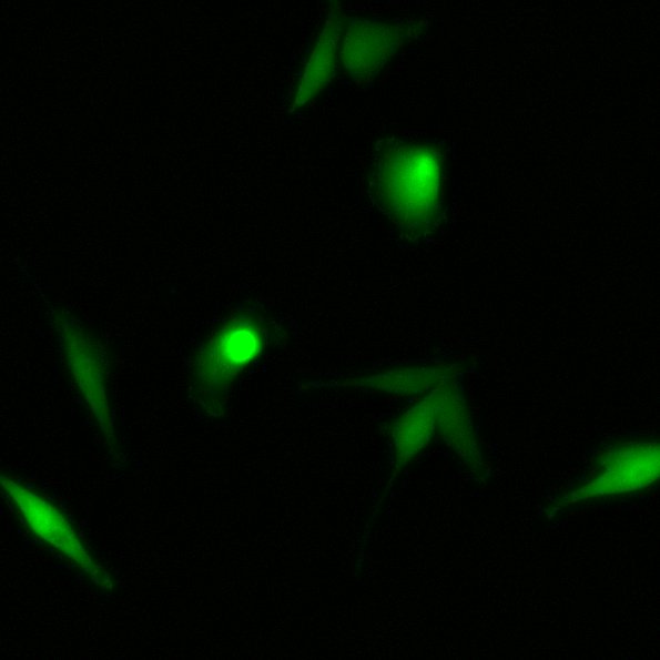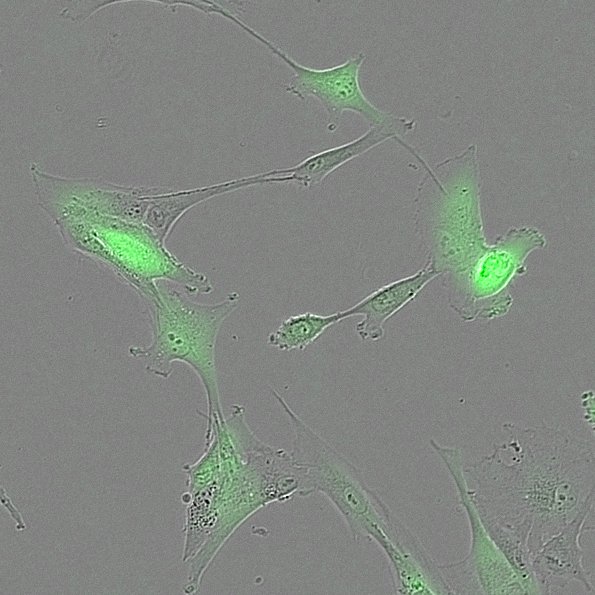 To analyze p16 activity, we measure the expression of a fluorescent protein controlled by the p16 promoter. Thus, the fluorescence intensity is directly proportional to the promoter activity in a given cell.