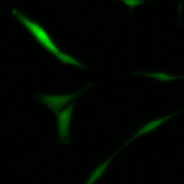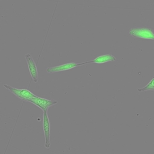 To analyze cell cycle inhibition we measure the p21 promoter activity, by using it to control a fluorescent protein gene expression. Thus, the fluorescence intensity is directly proportional to the promoter activity in a given cell.